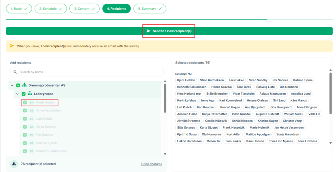 To avoid this limitation, we recommend adding all departments to the same distribution. If you need to send surveys at different times or if any employee is missing from the initial sending, you can use the "select recipient" function.