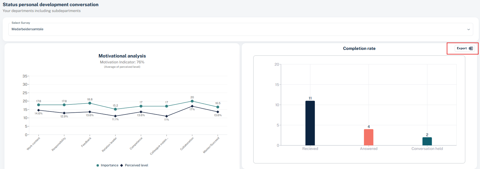 It displays the quantity of received and responded surveys, along with the number of completed conversations. As a leader overseeing multiple departments, you can view the breakdown of answered surveys and completed conversations per department in the graphs below.