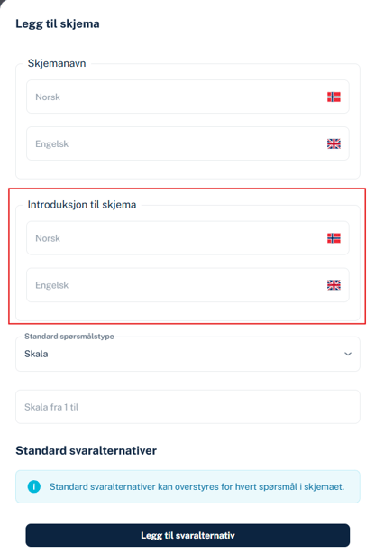 - Det er mulig å skrive en introduksjonstekst til hvert skjema i undersøkelsen.