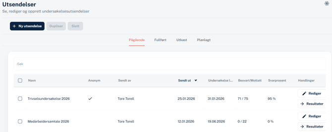 Husk! For å kunne hente frem totalresultatet i virksomheten, må undersøkelsen sendes ut til alle ansatte samtidig. Hvis du likevel ønsker å sende ut til forskjellig tidspunkt, bruk "legg til deltakere" i samme utsendelse.