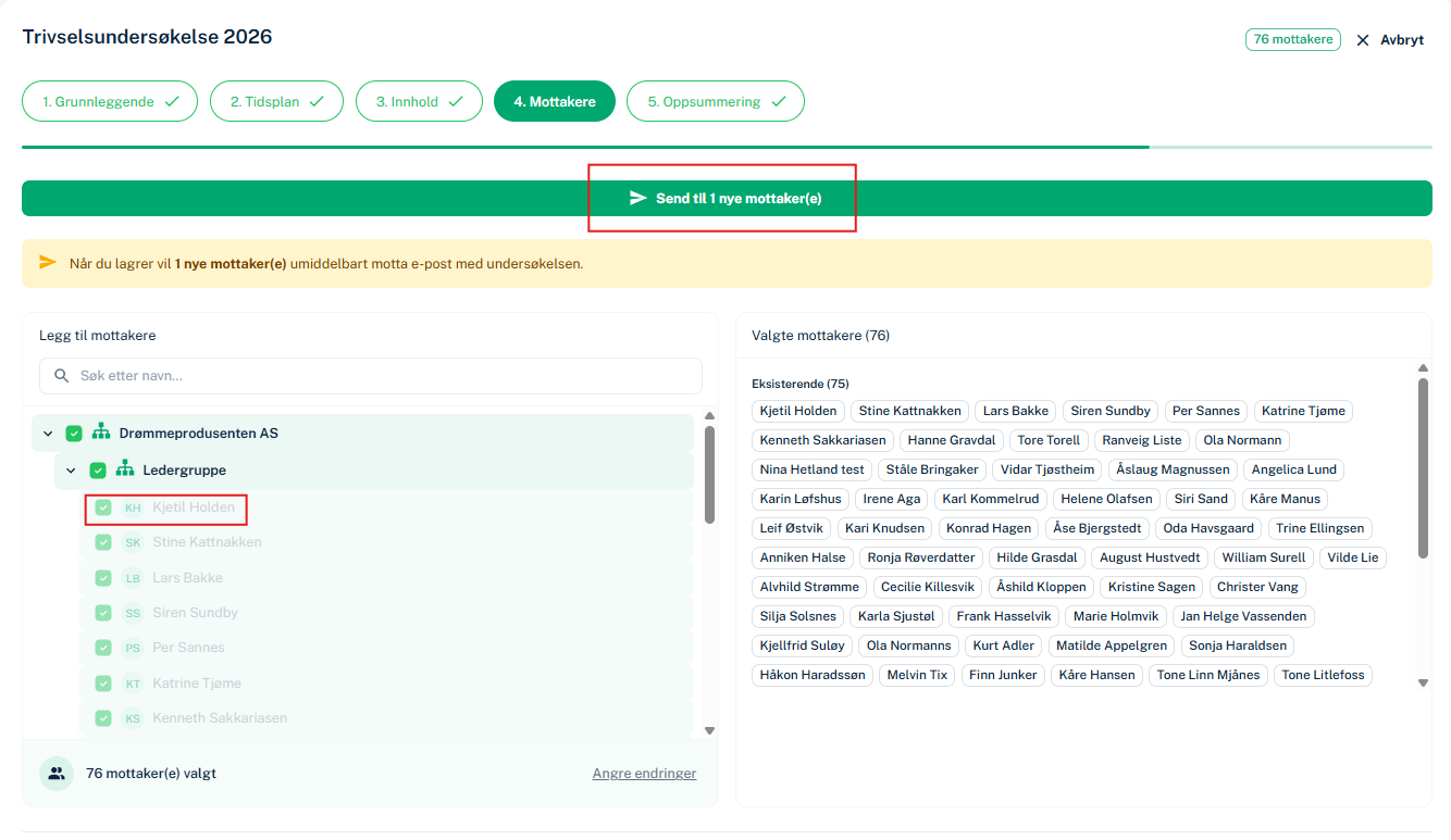 - Klikk "send" øverst og undersøkelsen vil kun bli sendt til nye mottakere