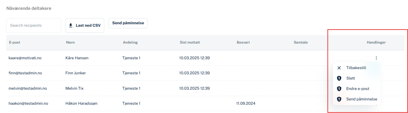 Du kan sende ut en ny påminnelse om å besvare undersøkelsen som er sendt ut, eller endre e-posten i en utsendelse.